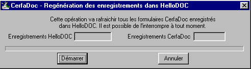 Cette fonction va ouvrir tous les enregistrements CerfaDoc effectués dans HelloDOC et les mettre à jour en tenant compte de la configuration actuelle de CerfaDoc (c'est à dire les formulaires actuels, le fait d'inclure ou non un résumé texte,etc).